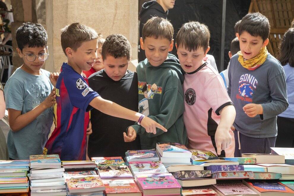 La jornada ha arrencat amb una lectura en veu alta protagonitzada per escolars, que ha reunit prop de 400 alumnes a la plaça Major i ha donat un to molt participatiu a l’inici de la diada. El mercat de llibres i roses, que es concentra al carrer del Carme i a la plaça del Carme, compta enguany amb 43 parades i s’allargarà de 10 del matí a 8 del vespre.